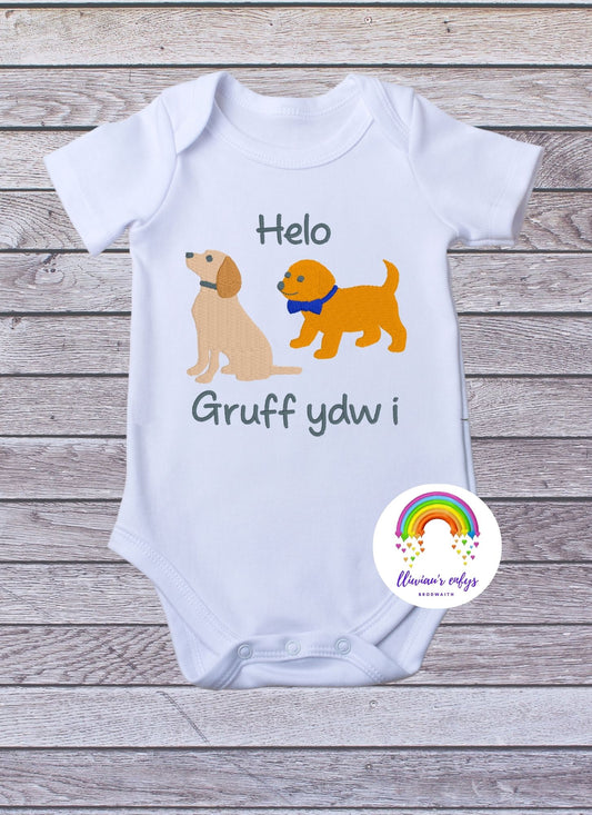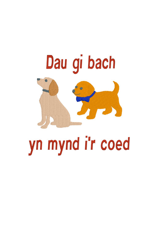 BRO-011 Embroidered two little dogs with Welsh text "Dau gi bach" on Babygrow