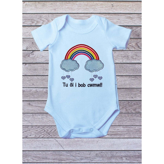 BRO-009 babygrow wedi ei frodio gyda'r geiriau Cymraeg "Tu ôl i bob cwmwl"