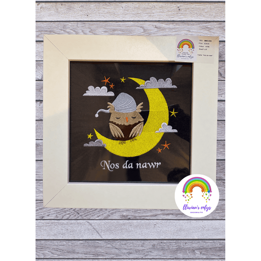 BRO-015 -Anrhegion i fabannod newydd anedig gyda'r geiriau "Nos da nawr" a thylluan mwn ffrâm.