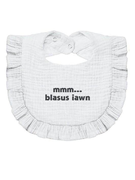 BRO-123-Baby Bib embroidered with Welsh text "mmm... blasus iawn!"