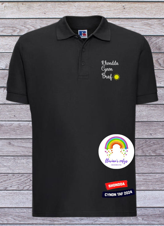 BRO-094- CRYSAU POLO du, navy a gwyn gyda thestun Cymraeg wedi'u frodio "Rhondda Cynon Braf"